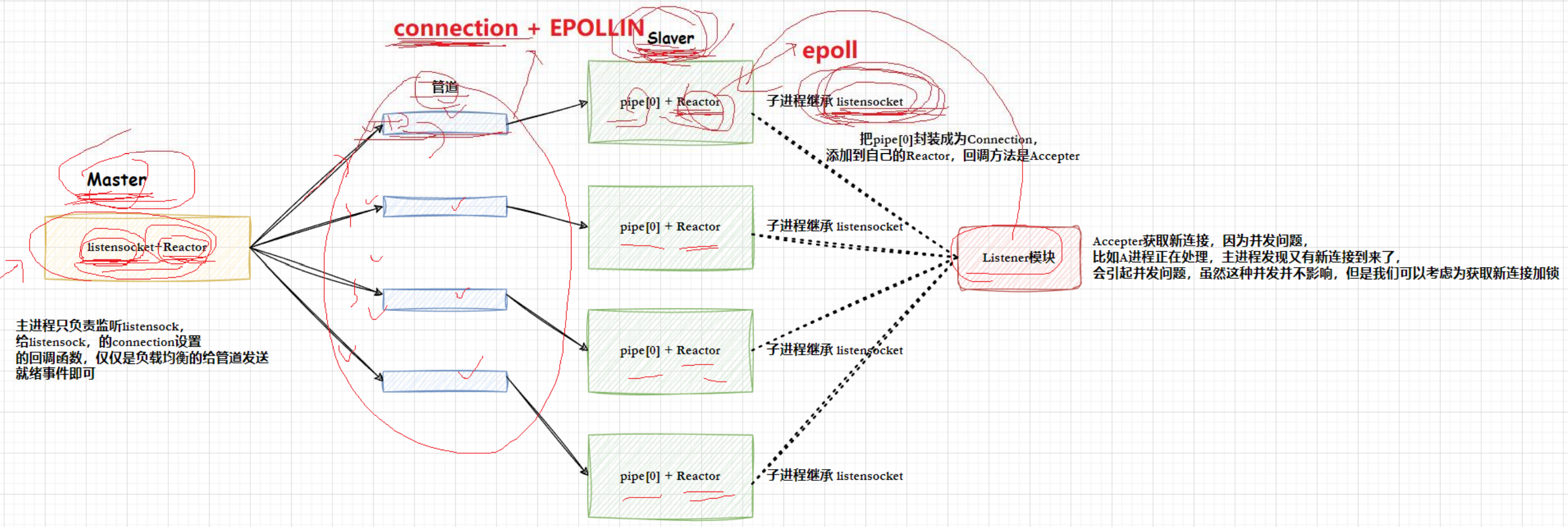 1)主进程创建Reactor,创建listensock并添加后,创建一批子进程,有对应的管道连接(进程池)