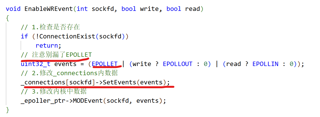 注意:EnableWREvent时,EPOLLET别写漏了;除了内核修改,Reactor内部的_connections也要修改。