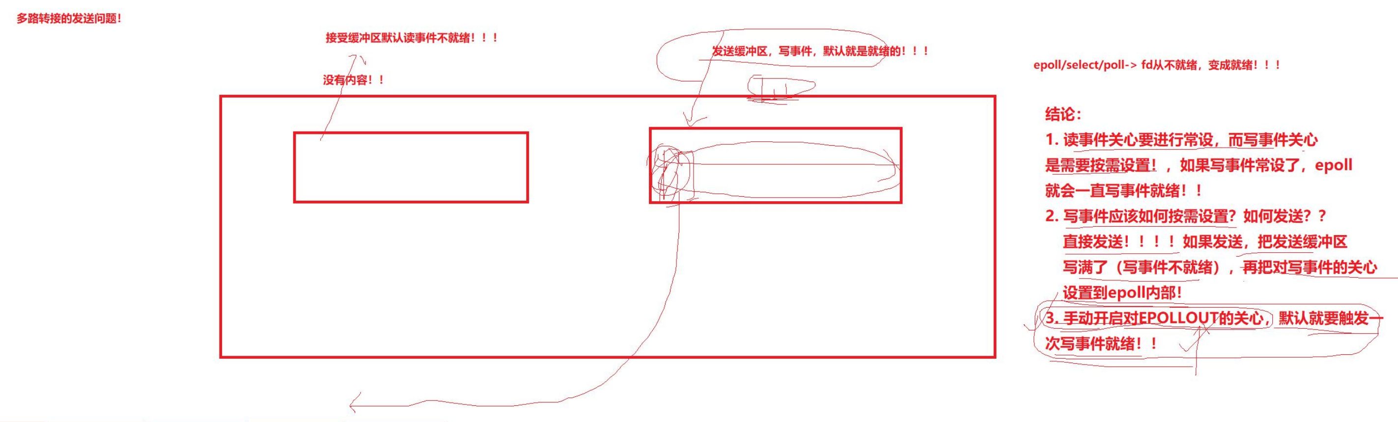 **第二种情况:需要开启对于写事件的关心。**下次wait成功,再写如果还是满就继续开启写事件关心;再写如果写完了,就把对应的写事件关心去掉。