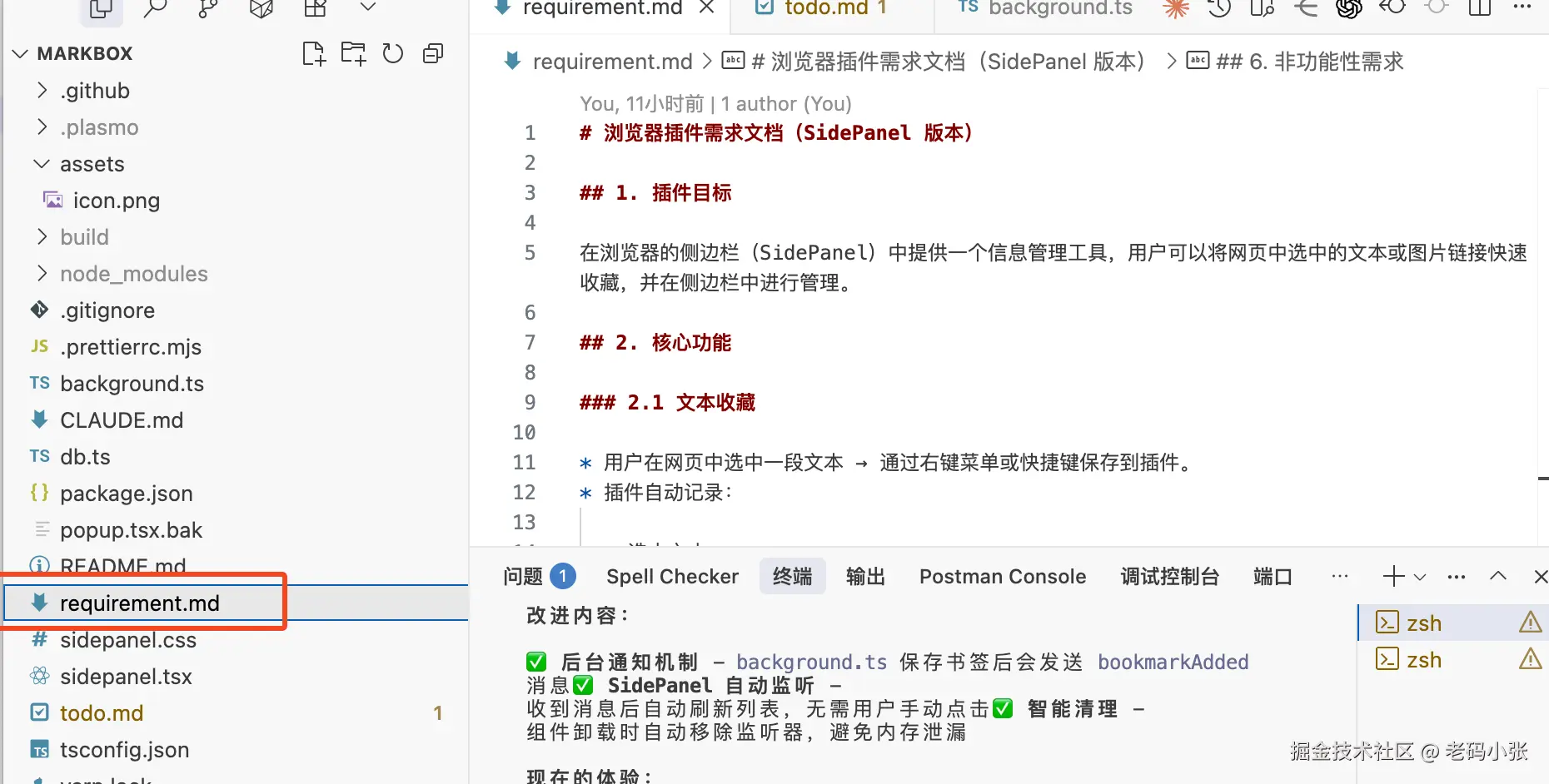 没错,我使用 plasmo 框架开发浏览器插件,然后真正的打工人是 Claude Code,他辅助实现,核心是我写了一个 requirement.md 这个是描述我具体的想做什么,就是我插件的核心功能了。