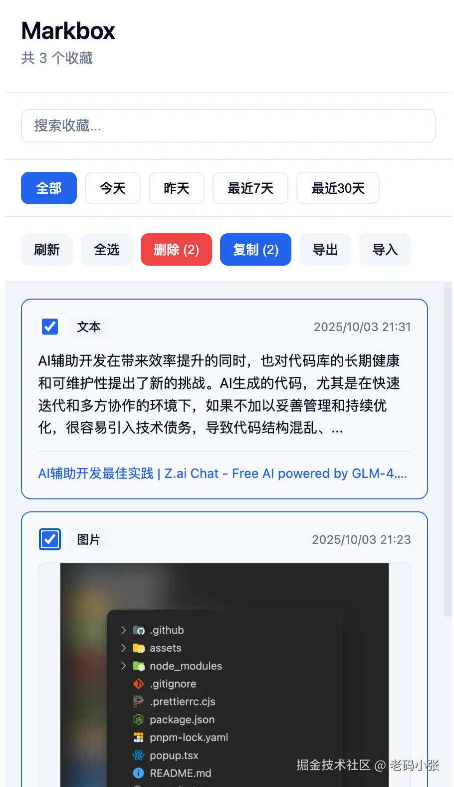 先直说结论:我做了一个浏览器侧边栏插件,叫 Markbox。用起来很简单------在网页上划一段文字,或右键一张图,存进侧边栏,随手整理、批量删、批量复制、导出/导入。看似不起眼,但它解决的不是"复制粘贴"技术问题,而是"信息流失与记忆碎片化"的深层问题。