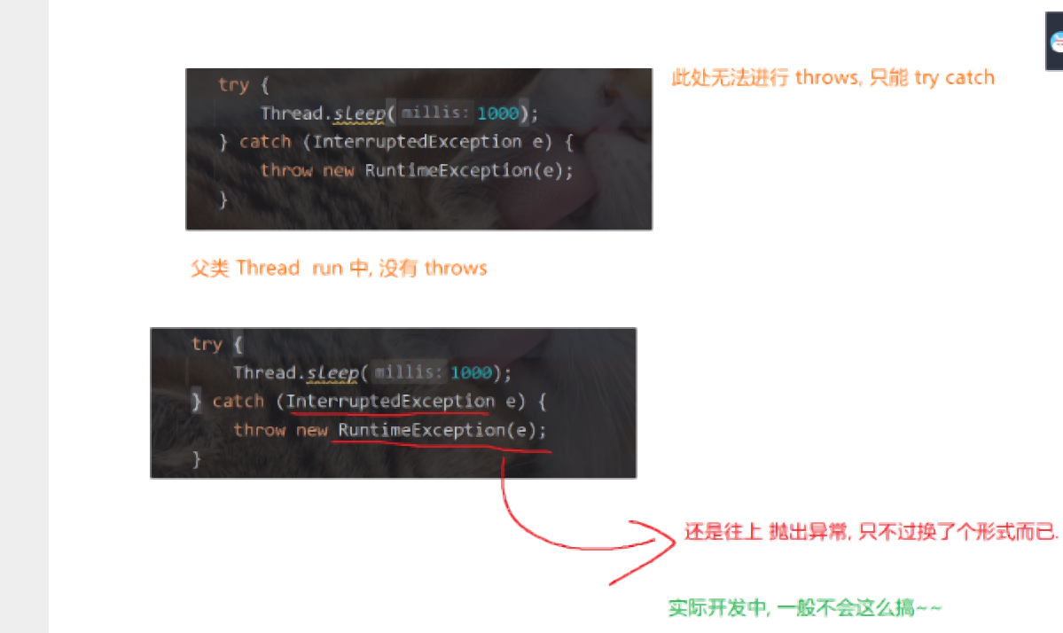 在Thread的run方法中没有抛出异常,所以我们用try catch去处理,但是在main方法中我们可以向上抛异常交给jvm处理
