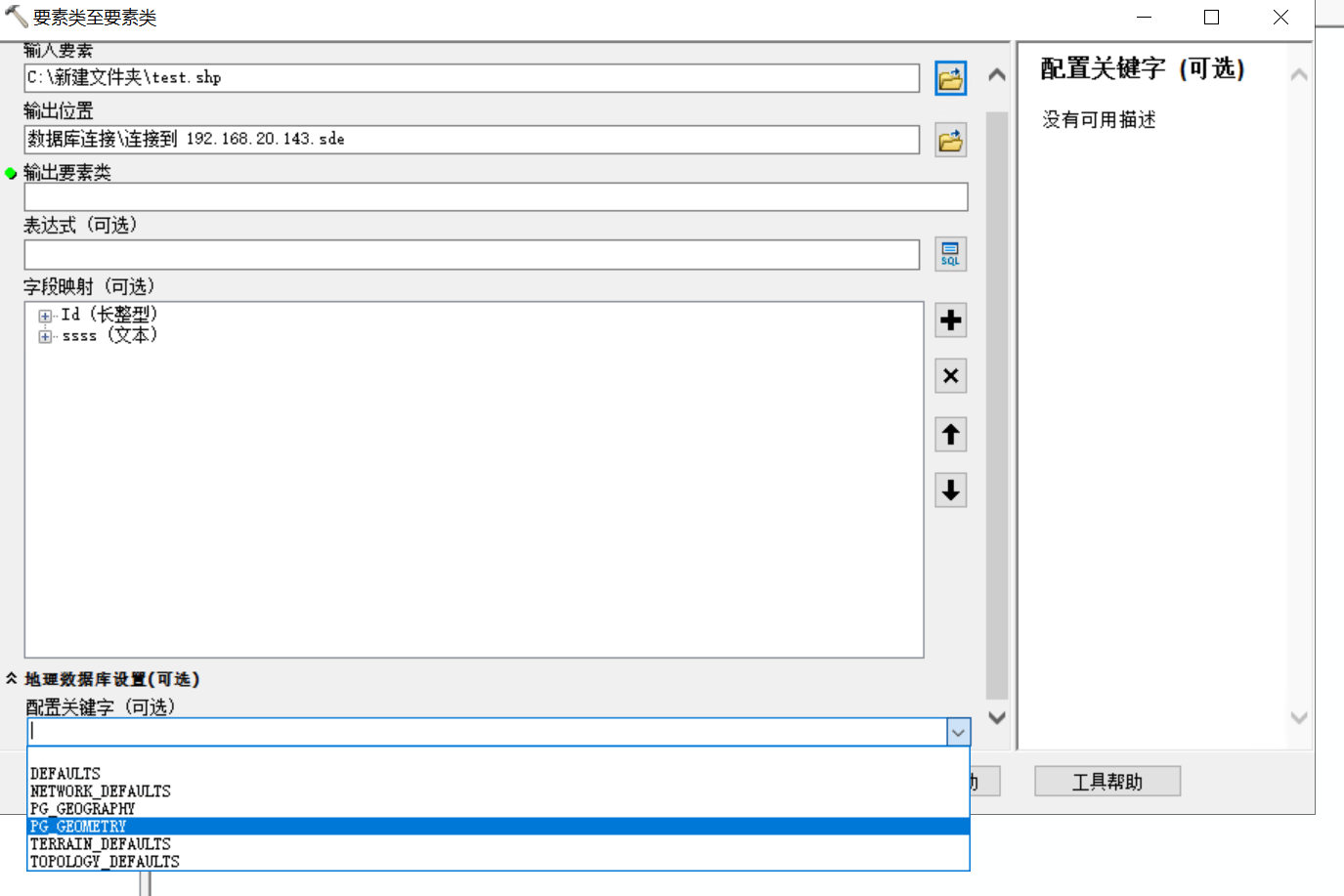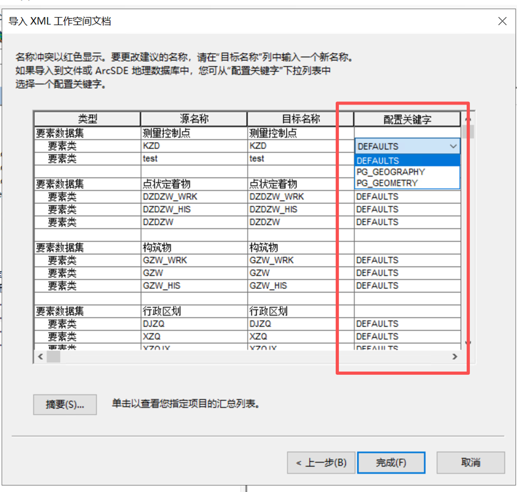 Arcgis默认状态下,空间字段名称必须是shape,字段类型一般是st_geometry,但是现在好一些国产化的数据库是geometry类型。只需入库时将空间字段改过来即可,xml工作文档入库的情形(选PG_GEOMETRY):