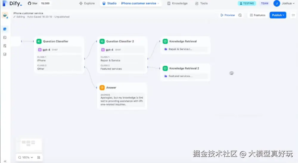 Dify:相较于Coze,Dify需要用户具备一定的开发与部署经验。它通常需要借助Docker等工具在代码环境中先行部署,再在其基础上进行可视化开发,在易用性和灵活性之间取得了较好平衡。用户同样可以使用Dify快速构建工作流。