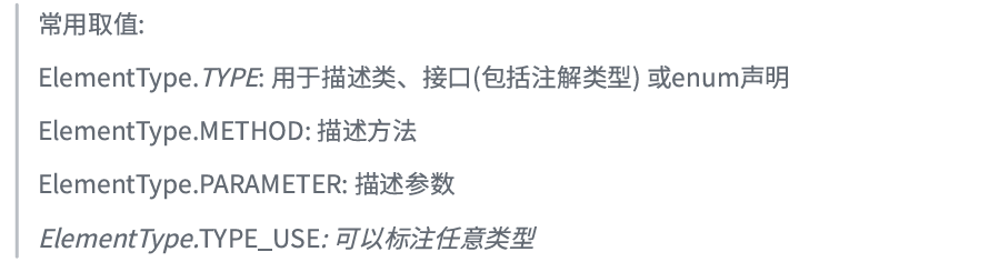 @Target 注解标识了 Annotation 所修饰的对象范围,即该注解可以用在什么地方