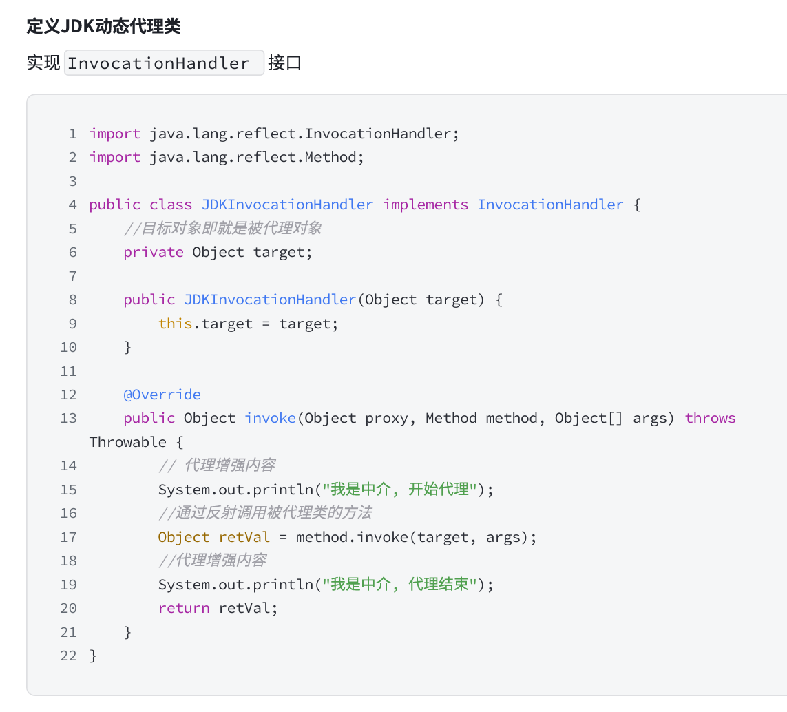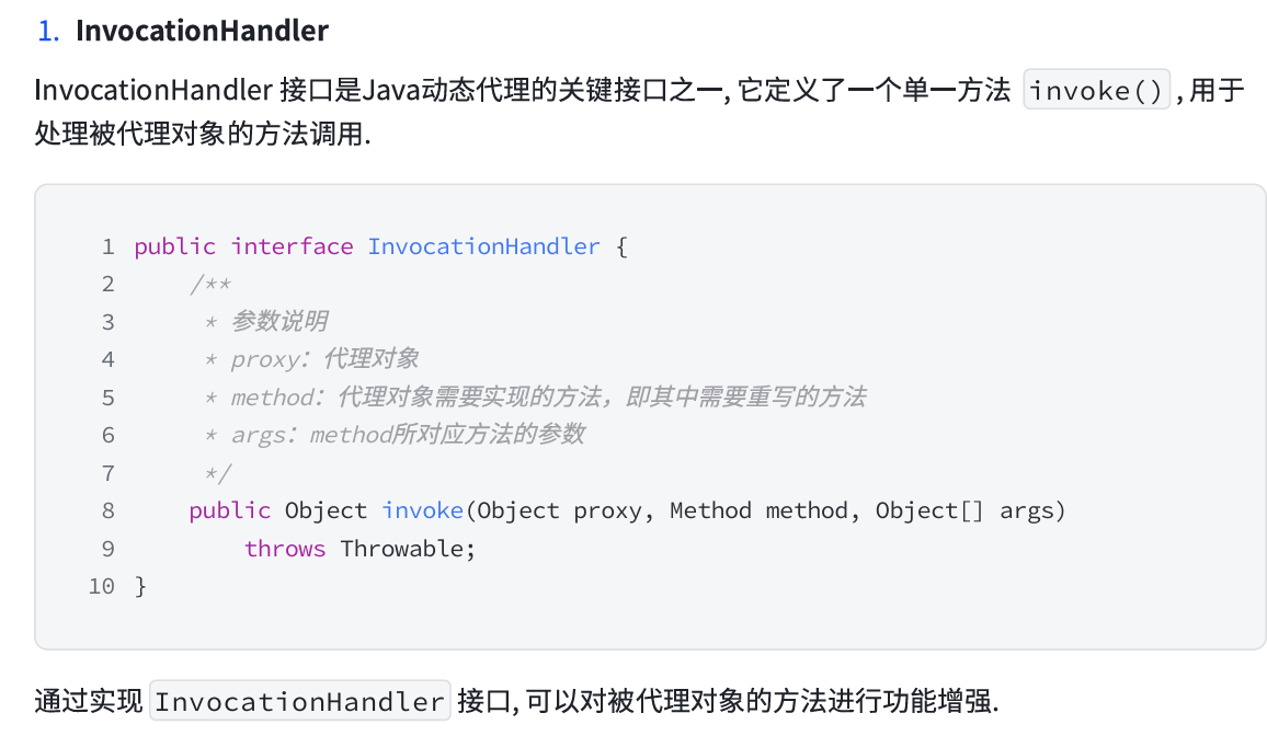 实现 InvocationHandler 接口并重写 invoke 方法,在 invoke 方法中,我们会调用目标方法,并做一些功能增强的逻辑