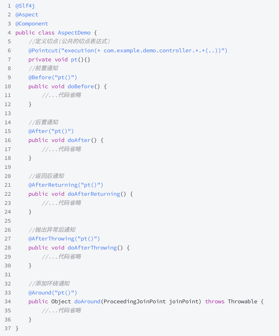上面代码案例中,存在大量的重复切点表达式,Spring 提供了 @PointCut 注解,将公共的切点表达式提取出来。