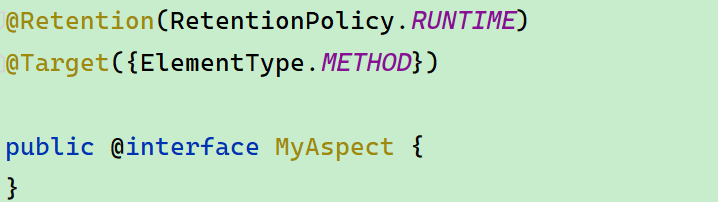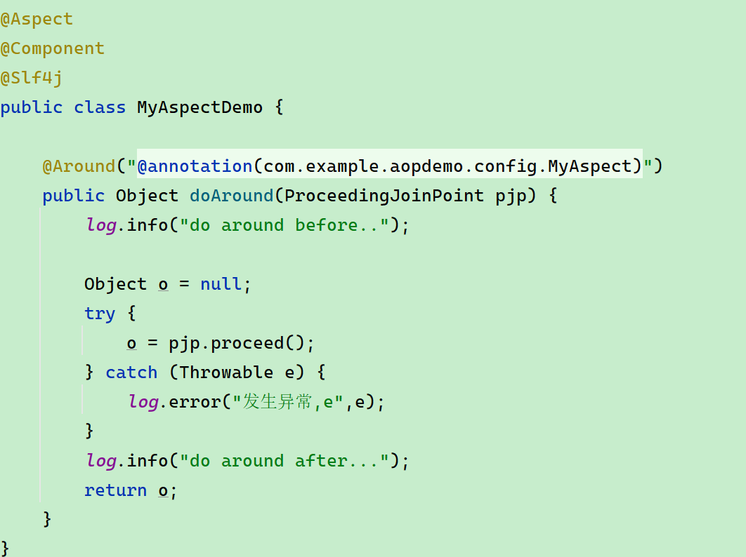 使用 @annotation 切点表达式来定义切点,只对 @MyAspect 生效
