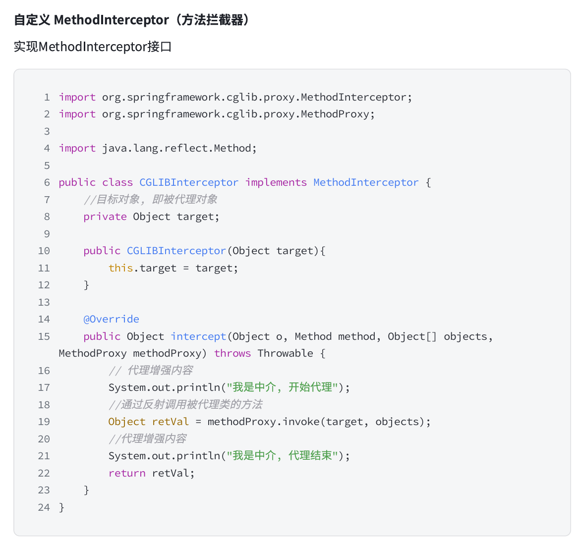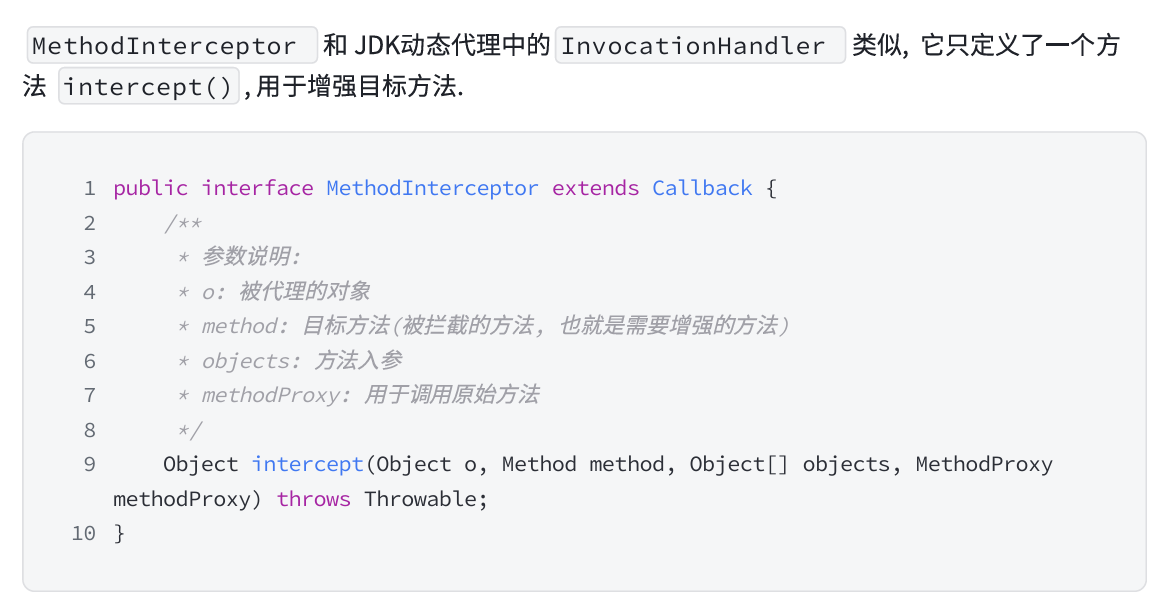 自定义方法 MethodInterceptor 并重写 intercept 方法,intercept 用于增强目标方法,和 JDK 代理中的 invoke 方法类似