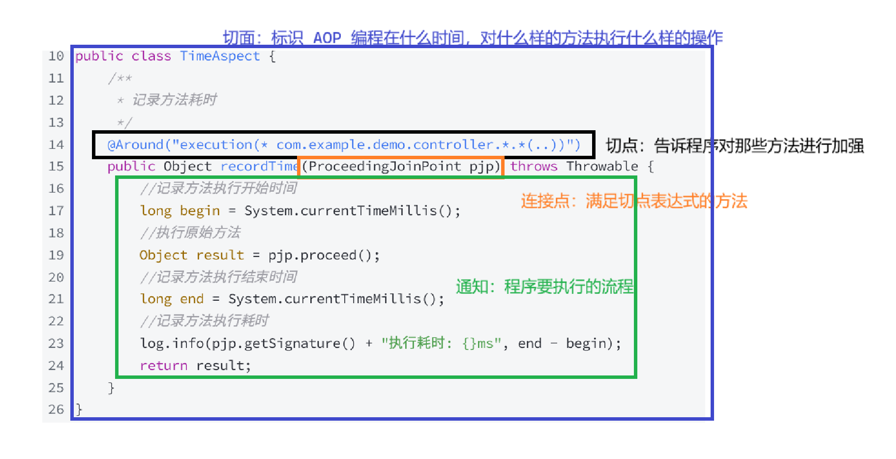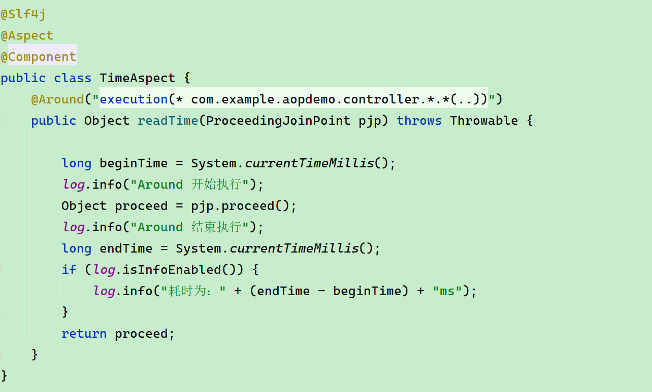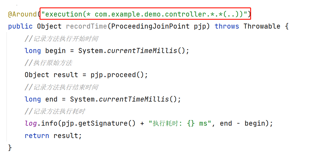 以上面程序为例,连接点就是 com.example.demo.controller 路径下的所有方法