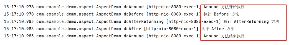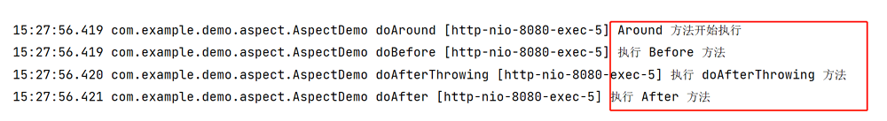 @Around 标识的通知方法包含两部分,一个前置逻辑,一个后置逻辑,前置逻辑会先于 @Before 标识的同时方法执行,后置逻辑会晚于 @After 标识的通知方法执行