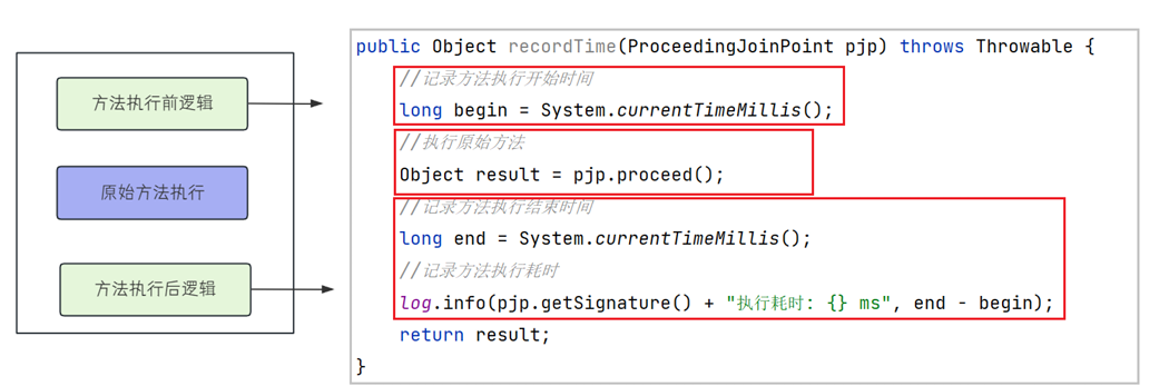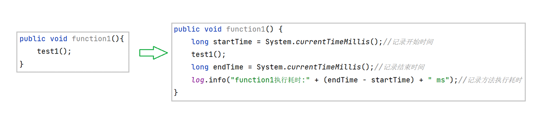 可以在业务方法执行前后,记录开始时间和结束时间,两者之差就是方法耗时。