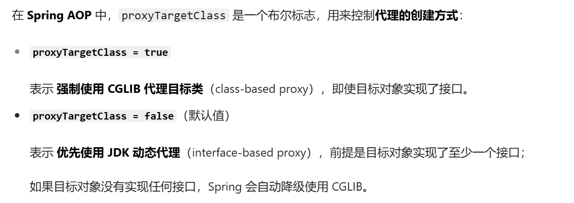 Spring 中,默认该属性为 false,如果实现了接口,使用 JDK 代理,如果是普通类,则使用 CGLIB 代理。