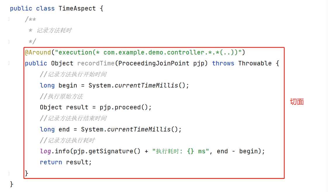 切面所在的类,我们一般称为 切面类(Aspect 注解标识)