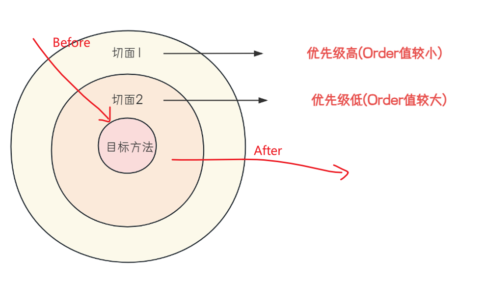 当我们在项目中,定义了多个切面类,并且这些切面类的多个切入点都匹配到了同一个目标方法,则这几个通知方法的执行顺序如何?
