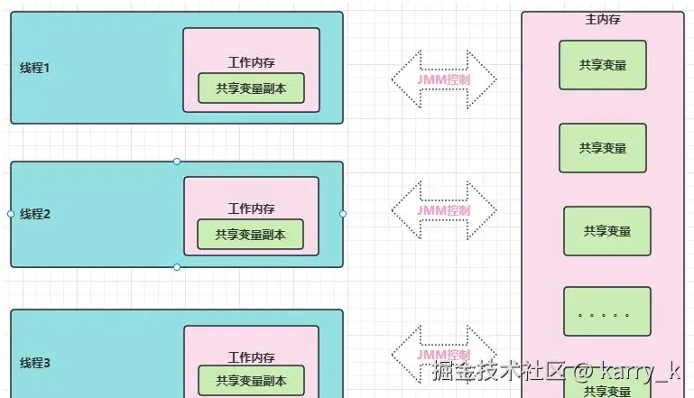 - 注意:这里的"主内存"与JVM内存区域中的"Java堆"或"方法区"在概念上有所关联但并不等同。可以理解为,堆和方法区中存储的共享数据,逻辑上都属于JMM的主内存范畴