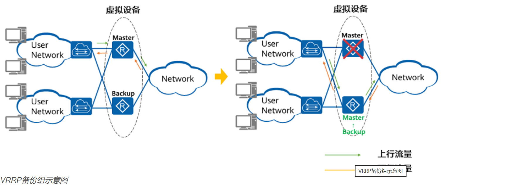 主设备(Master)负责转发流量,从设备(Backup)处于待命状态,主设备故障后由 Backup 自动接管,保证网关的高可用性。