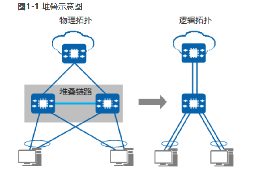 多台物理交换机通过堆叠线缆连接,逻辑上组成"一台设备",统一控制和管理。
