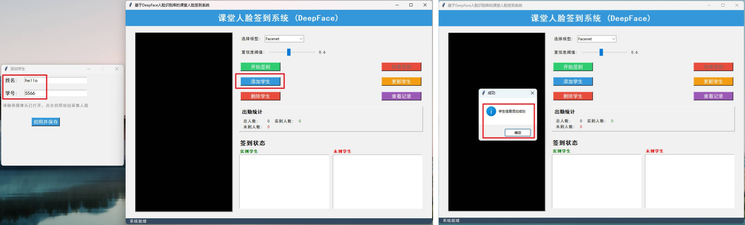 - 添加学生:输入姓名和学号后,通过摄像头采集人脸图像,检测合格后保存至数据库和本地文件夹,并更新特征库。