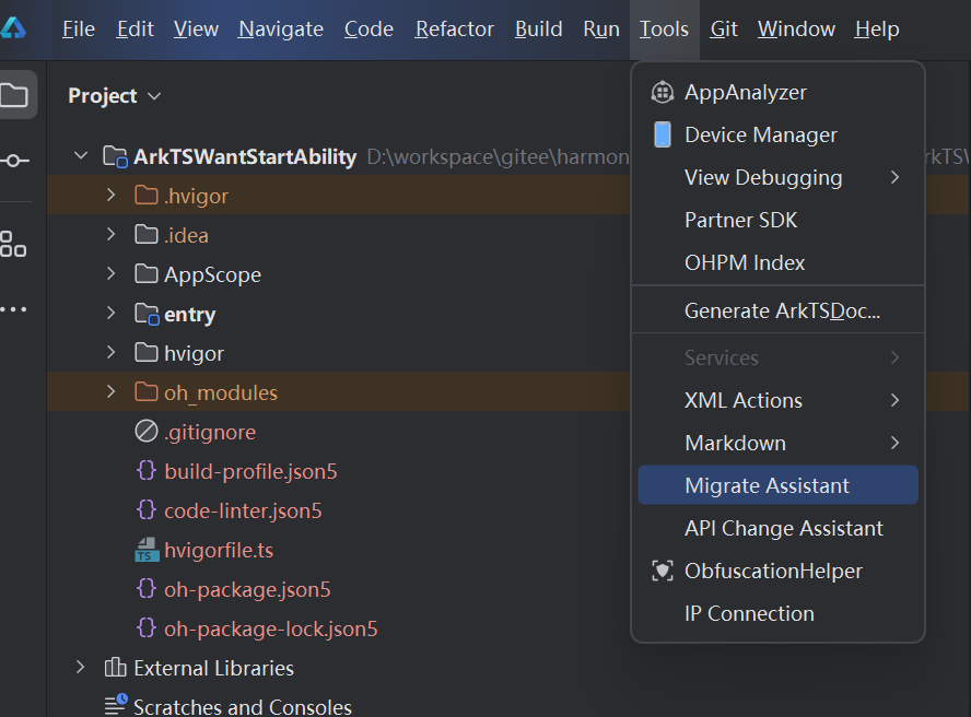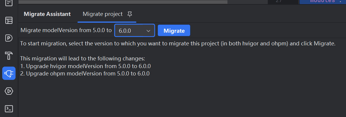 To start migration, select the version to which you want to migrate this project (in both hvigor and ohpm) and click Migrate.