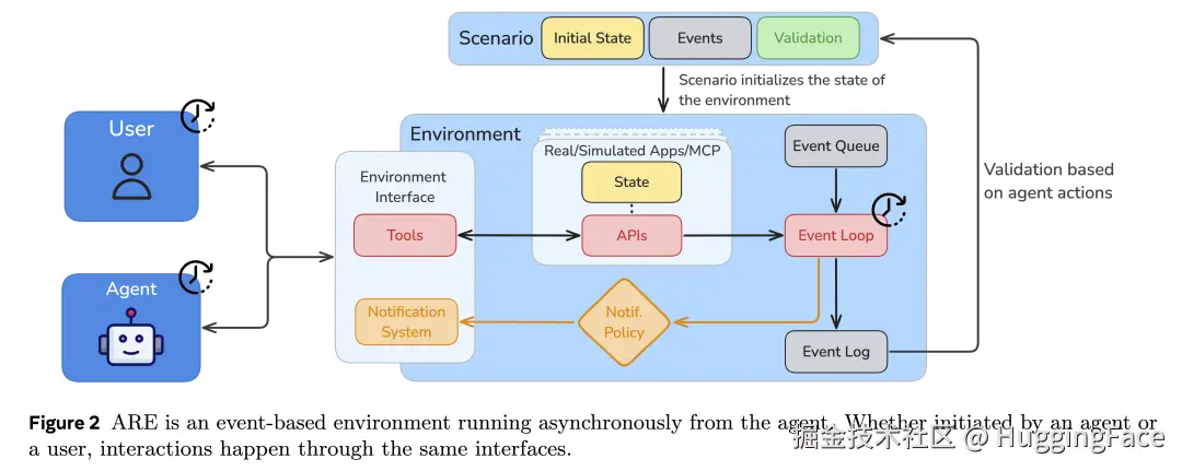Gaia2 运行在 ARE(Agent Research Environments)执行环境中,在这里,用户可以选择任意智能体,并赋予其对一系列应用程序及预置数据的访问能力。