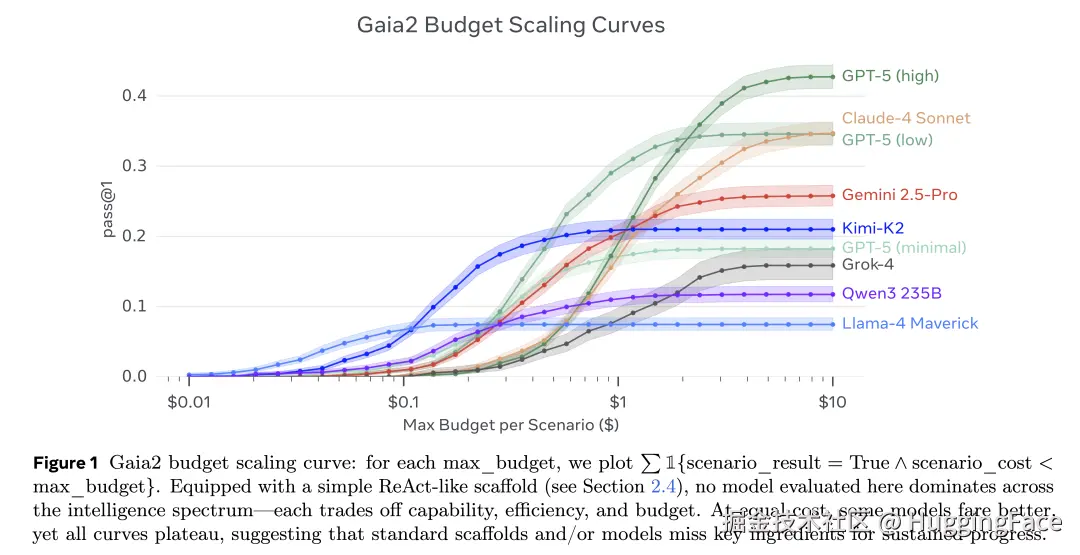 图 1:Gaia2 的预算扩展曲线(Budget Scaling Curves)。随着预算增加,智能体在任务上的表现逐渐提升,用于展示在复杂环境中智能体能力随资源投入的变化趋势。