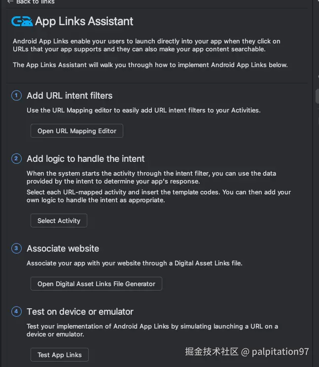 Android studio 提供了更快捷的配置:Tools → App Links Assistant → Create AppLink; 一共有四部,按照流程即可配置完成。