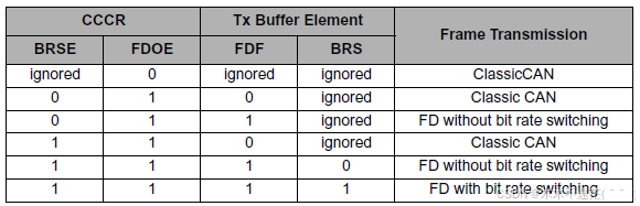 CAN FD 传输的启用需满足 "CCCR.FDOE=1"