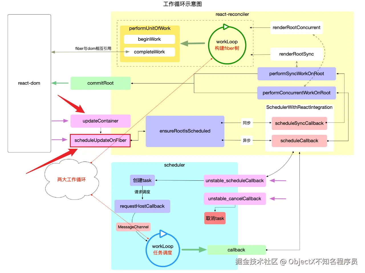 本篇已经到了scheduleUpdateOnFiber函数进入调和,也就是react-reconciler的工作,下一篇我们将讲解react的render流程,下图来自图解react