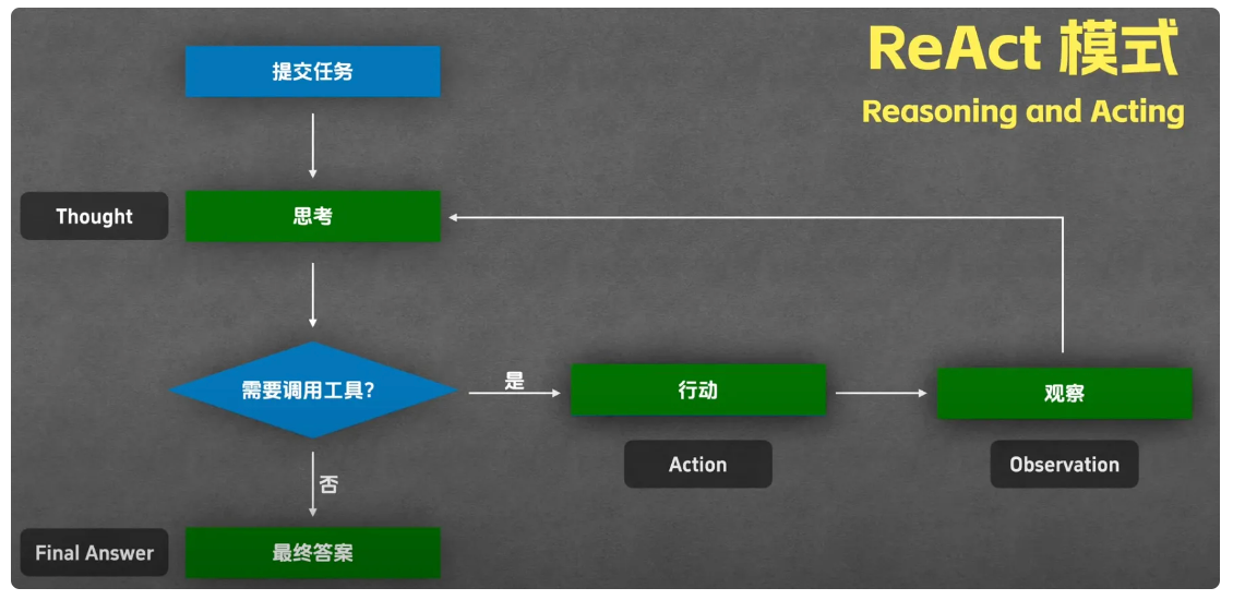 在 ReAct 模式下,整个流程以 "用户提交任务" 为起点:首先,Agent 会进行 "思考(Thought)",判断是否需要调用工具;若需要,便调用合适的工具执行 "行动(Action)"(如读写文件);行动后,Agent 会查看工具的执行结果,即 "观察(Observation)"(如文件是否写入成功、读取的文件内容);基于观察结果,Agent 会再次思考,判断是否需要继续调用工具 ------ 若需要,则重复 "行动→观察→思考" 的循环;直至 Agent 认为无需再调用工具,可直接给出结论时,便输出 "最终答案(Final Answer)",流程至此结束。可见,ReAct 模式的核心步骤是 "Thought→Action→Observation→Final Answer"。