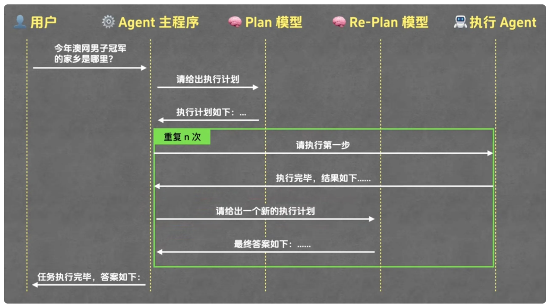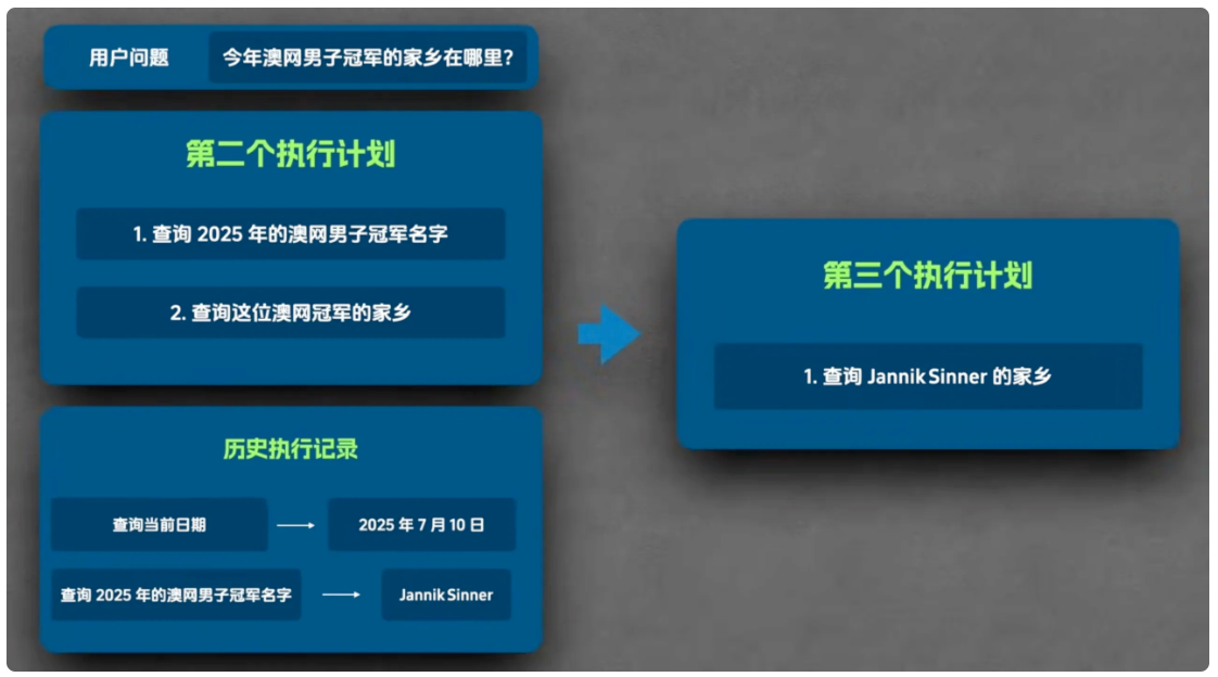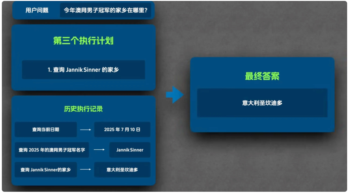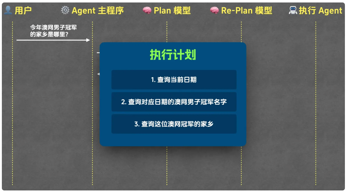 接下来结合具体案例("查询今年澳网男子冠军的家乡",其中 "澳网" 指澳大利亚网球公开赛),详细拆解 Plan-And-Execute 模式的完整运行流程: