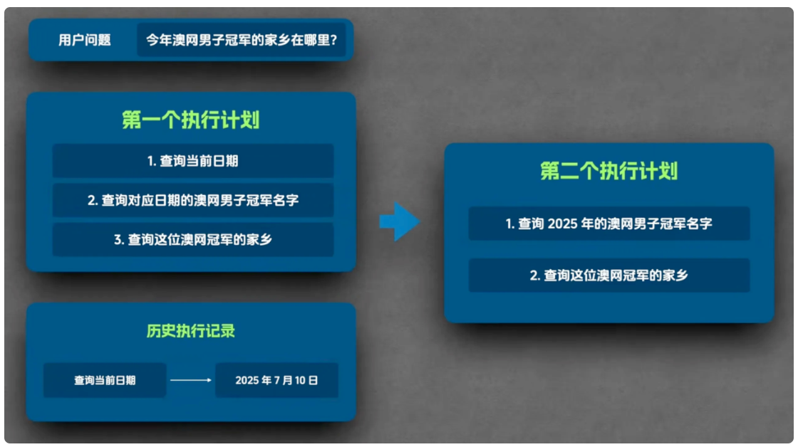 首先,用户将任务 "今年澳网男子冠军的家乡是哪里" 提交给 Agent 主程序。Agent 主程序接到任务后,会将其传递给 Plan 模型,由 Plan 模型生成初始执行计划。以当前时间可能为 2024 年或 2025 年为例,合理的初始计划通常包含三步:第一步,查询当前日期;第二步,根据当前日期确定对应年份,查询该年份澳网男子冠军的名字;第三步,根据冠军名字查询其家乡。