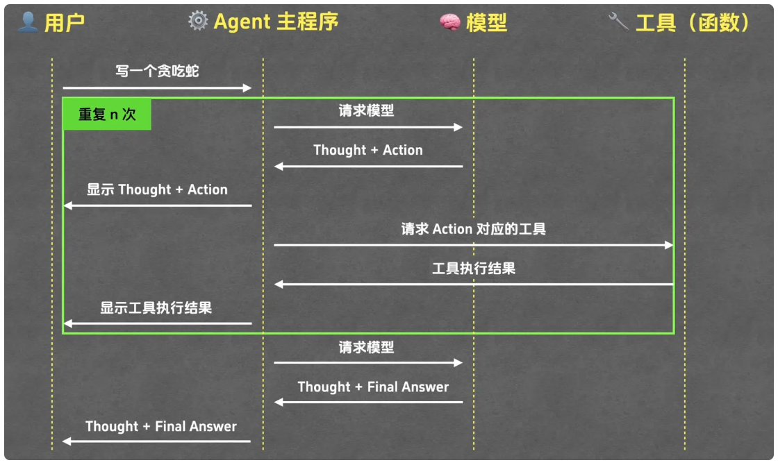 ● 代码核心逻辑: 首先定义可用工具(读取文件、写入文件、运行终端命令的函数),然后构建 "ReActAgent 类"------ 该类需传入 "工具列表""所用模型(如 GPT-4o)""项目目录(snake 文件夹)" 三个参数;接着提示用户输入任务,调用 agent.run