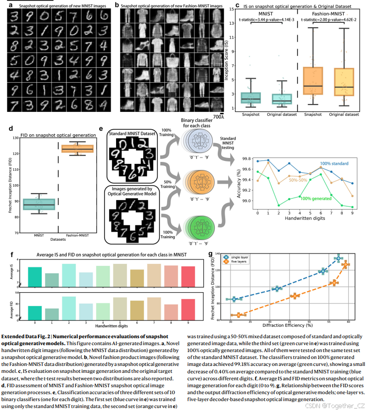 本图包含 AI 生成的图像。a, 由快照光学生成模型生成的全新手写数字图像(遵循 MNIST 数据分布)。b, 由快照光学生成模型生成的全新时尚产品图像(遵循 Fashion-MNIST 数据分布)。c, 在快照图像生成和原始目标数据集上进行的 IS 评估,其中还报告了两个分布之间的 t 检验结果。d, MNIST 和 Fashion-MNIST 快照光学图像生成过程的 FID 评估。e, 三组不同的 10 个二进制分类器(每个数字一个)的分类准确率。第一组(图 e 中的蓝色曲线)仅使用标准 MNIST 训练数据进行训练,第二组(图 e 中的橙色曲线)使用由标准和光学生成图像数据组成的 50-50% 混合数据集进行训练,而第三组(图 e 中的绿色曲线)使用 100% 光学生成图像进行训练。所有这些都在标准 MNIST 数据集的相同测试集上进行测试。使用 100% 生成图像数据训练的分类器平均准确率达到 99.18%(绿色曲线),与标准 MNIST 训练(蓝色曲线)相比,平均下降了 0.40%。f, 每个数字(0 到 9)的快照光学图像生成的平均 IS 和 FID 指标。g, 光学生成模型的 FID 得分与输出衍射效率之间的关系;基于一层和五层解码器的快照光学图像生成。