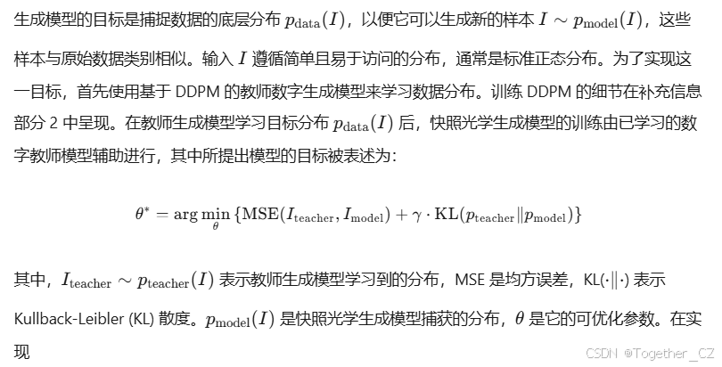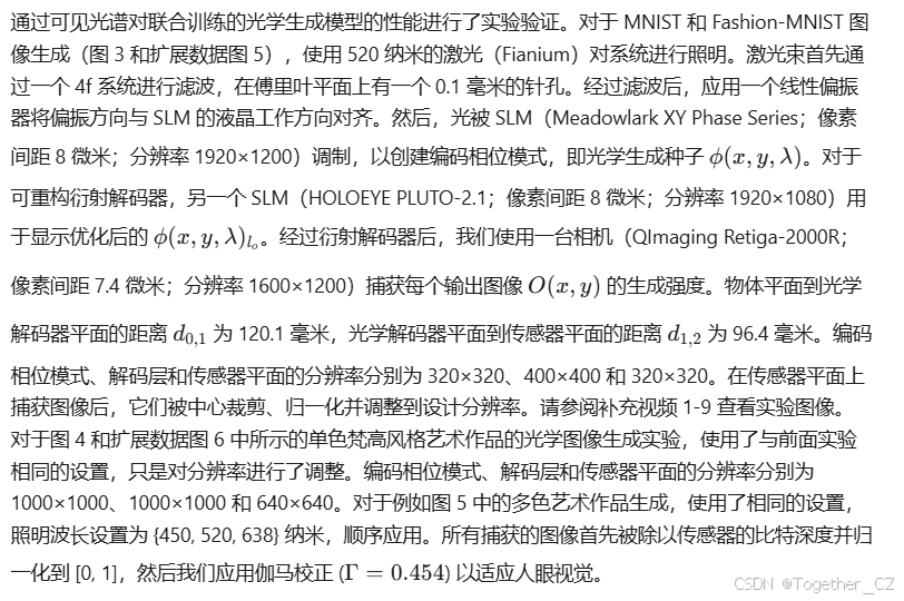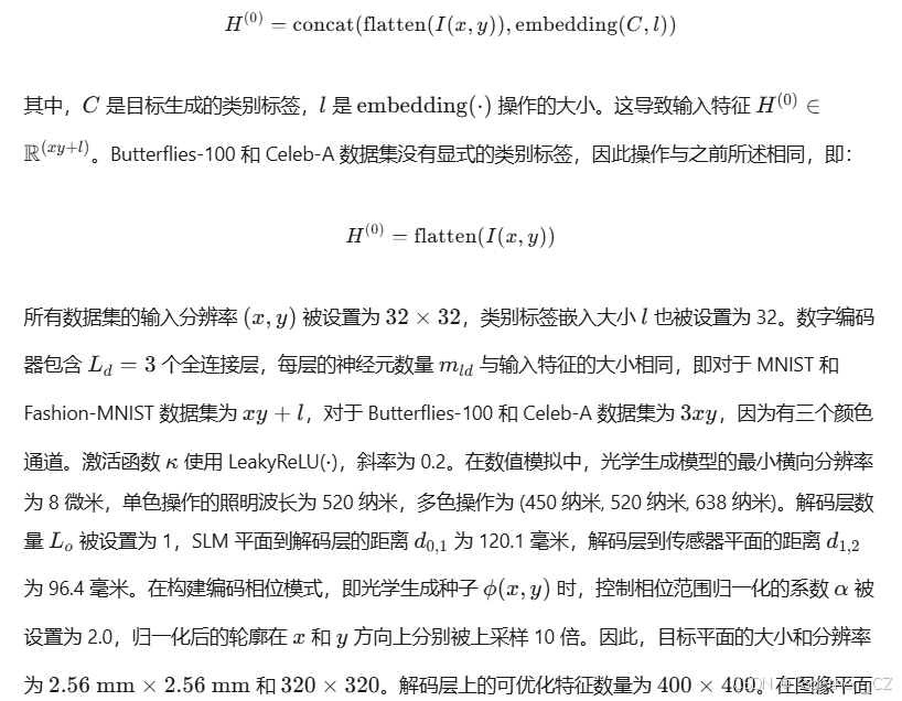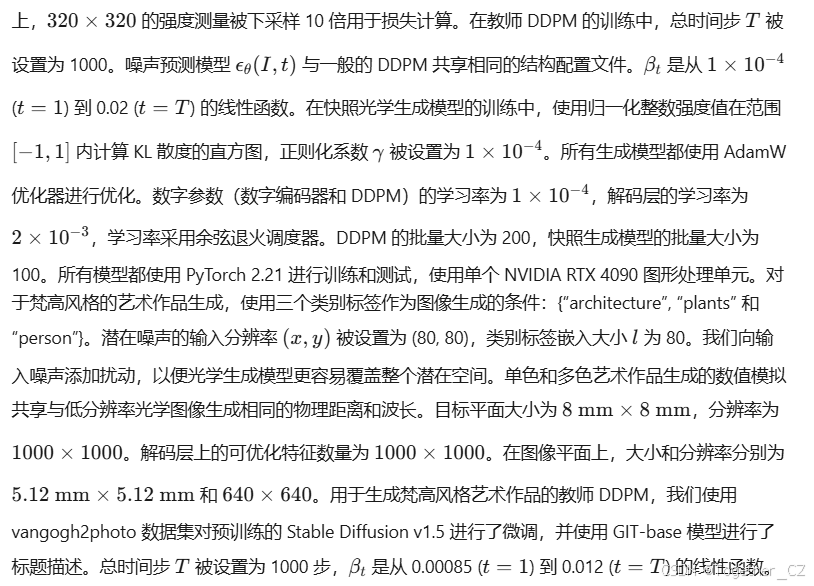 训练过程如图1b所示,我们首先基于去噪扩散概率模型(DDPM)训练一个教师数字生成模型,以学习目标数据分布。训练完成后,该DDPM模型被冻结,并持续生成噪声-图像数据对,用于训练快照光学生成模型。浅层数字相位编码器与光学生成模型进行联合训练,使模型能够以简单且可重构的架构高效学习目标分布。