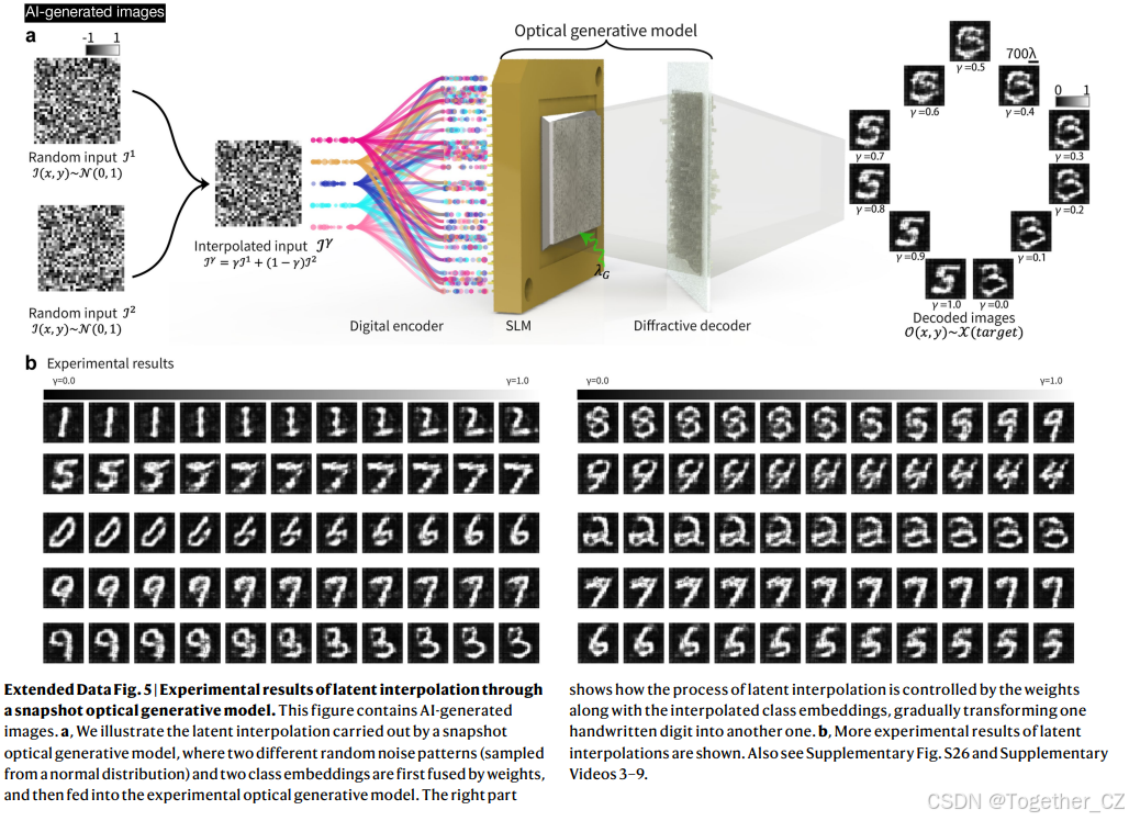 为了探索快照光学生成模型的潜在空间,我们进行了实验,以研究随机噪声输入和生成图像之间的关系(扩展数据图 5、补充图 26 和补充视频 3-9)。如扩展数据图 5a 所示,从正态分布 N(0,I) 中采样两个随机输入 J1 和 J2,并使用方程 γJ=γJ1+(1−γ)J2 进行线性插值,其中 γ 是插值系数。需要注意的是,类别嵌入也以与输入相同的方式进行插值。插值后的输入 Jγ 和类别嵌入随后被送入训练有素的数字编码器,产生相应的生成相位种子,该种子被送入快照光学生成设置以输出相应的图像。扩展数据图 5b 展示了使用我们的光学生成设置对手写数字结果图像进行这种插值的实验结果。每一行显示从 J1(最左侧)到 J2(最右侧)生成的图像,中间图像由 γ 从 0 变化到 1 的插值输入产生。生成的图像在不同手写数字之间显示出平滑的过渡,表明快照光学生成模型学习了一个连续且组织良好的潜在空间表示。值得注意的是,使用插值后的类别嵌入表明所学习的模型实现了外部泛化:在整个插值过程中,生成的图像保持可识别的数字特征,通过插值后的类别嵌入逐渐将一个手写数字转换为另一个数字,表明有效地捕捉了手写数字的底层数据分布。我们光学设置的更多基于插值的实验图像生成结果如补充图 26 和补充视频 3-9 所示。