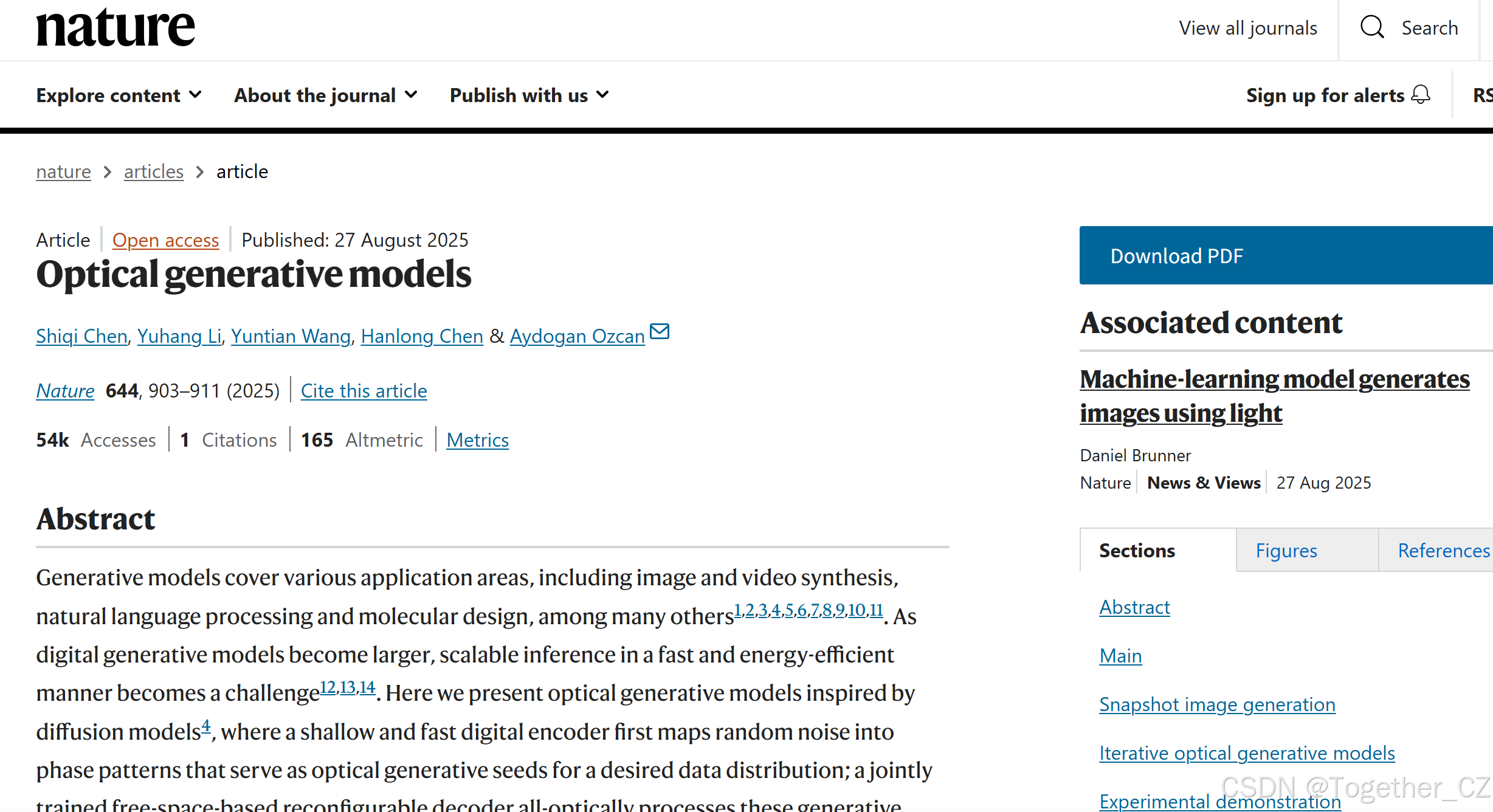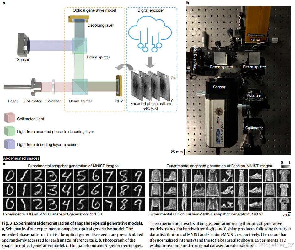 这篇文章介绍了一类全新的生成式人工智能模型------光学生成模型(Optical Generative Models) ,其核心思想是利用光学系统和光传播过程本身来执行图像生成任务 ,从而实现高效、低功耗、可扩展的图像合成。以下是文章主要研究内容的总结: