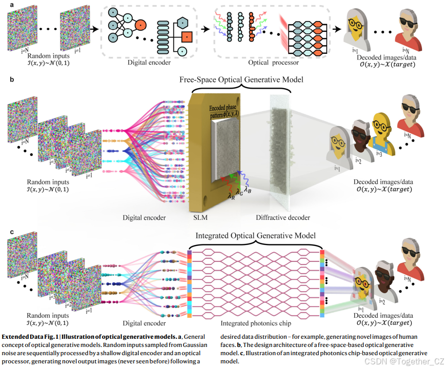 a, 光学生成模型的一般概念。从高斯噪声中随机采样的输入依次经过浅层数字编码器和光学处理器,生成遵循期望数据分布的全新输出图像------例如,生成全新的人脸图像。b, 自由空间基础光学生成模型的设计架构。c, 集成光子芯片基础光学生成模型的示意图。