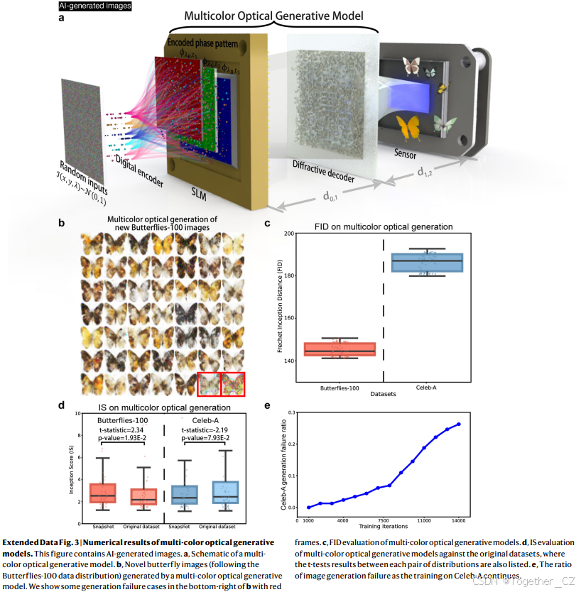 依次加载到同一个输入 SLM 上(扩展数据图 3a)。在相应波长的顺序照明下,通过一个固定衍射解码器生成遵循期望数据分布的多色图像,该解码器针对相同的图像生成任务进行了联合优化。生成的多色图像像以前一样在同一个图像传感器上记录。我们使用 3 种不同的波长(450 纳米、520 纳米、638 纳米)对扩展数据图 3a 中展示的多色光学图像生成框架进行了数值测试,其中 2 种不同的生成光学模型分别在 Butterflies-100 数据集和 Celeb-A 数据集上进行了训练。由于这两个图像数据集没有显式的类别,浅层数字编码器仅使用随机采样的高斯噪声作为输入,而不使用类别标签嵌入。例如,扩展数据图 3b 展示了多色光学生成模型生成的各种蝴蝶图像,揭示了遵循相应数据分布的各种图像特征和特性。在扩展数据图 3c 和 d 中,也展示了 Butterflies-100 和 Celeb-A 数据集的FID 和 IS 性能指标。IS 指标和 t 检验结果表明,与原始 Butterflies-100 数据集相比,光学多色图像生成模型在图像多样性和 IS 分数方面具有统计学意义上的显著改进(P<0.05),而与原始 Celeb-A 数据分布相比,没有显示出统计学意义上的显著差异。此外,一些失败的图像生成案例在扩展数据图 3b 的右下角用红框突出显示。这些罕见案例是基于噪声方差标准自动识别的,其中估计噪声方差(σ2)超过经验阈值 0.015 的生成图像被分类为生成失败。分别在 Butterflies-100 和 Celeb-A 数据集的光学生成图像中观察到 3.3% 和 6.8% 的图像生成失败。扩展数据图 3e 揭示了随着训练的继续,这种图像生成失败变得更加严重。这种行为在概念上类似于有时在训练阶段后期观察到的模式崩溃问题,使得训练时间更长的多色光学生成模型的输出局限于一些重复的图像特征。