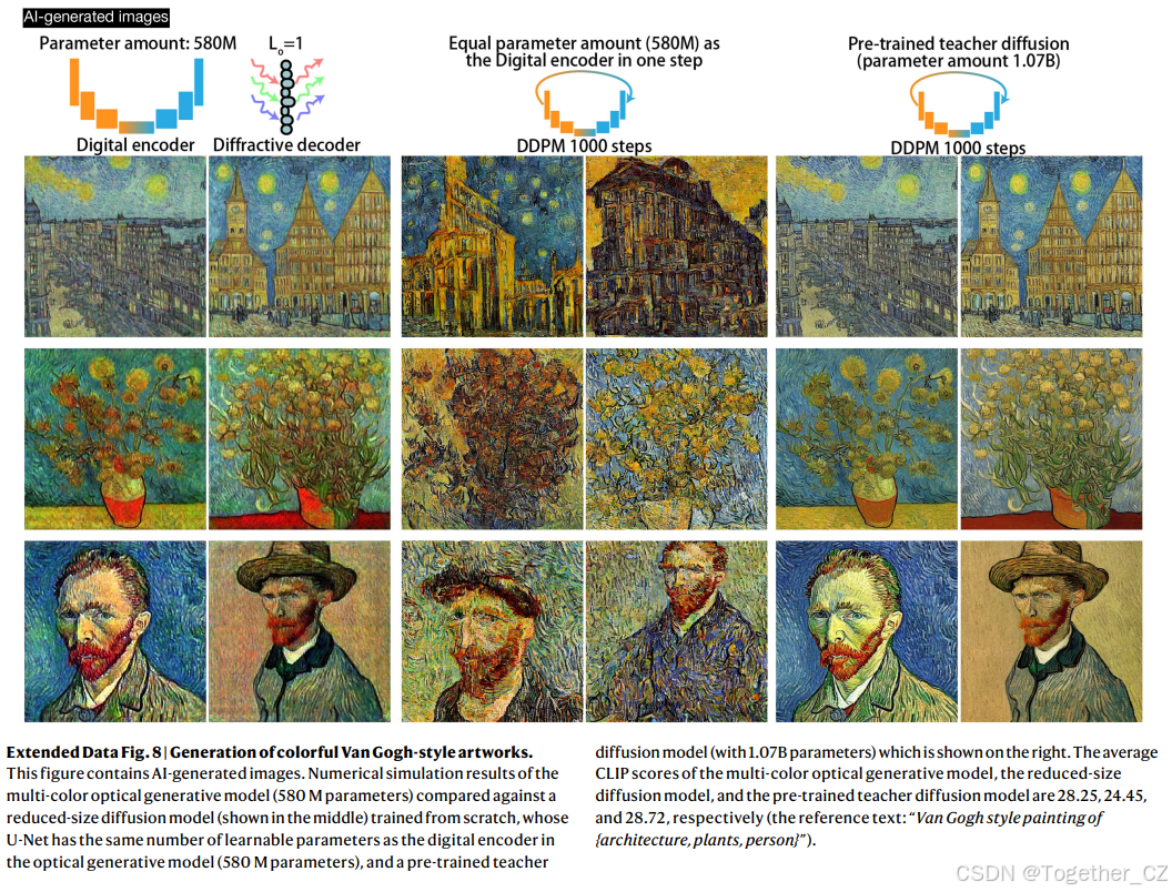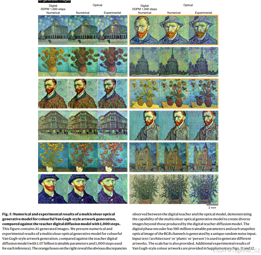 本图包含 AI 生成的图像。我们展示了数字教师扩散模型(使用 10.7 亿个可训练参数和每张图像 1000 步推理)和快照光学生成模型在单色梵高风格全新艺术作品生成上的对比结果,以及快照光学生成模型的实验结果。数字相位编码器有 8500 万个可训练参数,每张快照光学图像由一个独特的随机噪声输入生成。