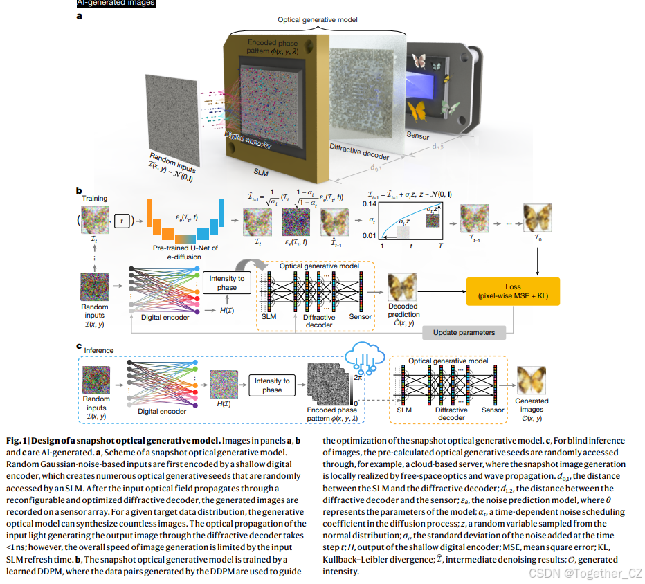生成模型广泛应用于图像与视频合成、自然语言处理、分子设计等多个领域。随着数字生成模型规模的不断扩大,实现快速且能效高的可扩展推理成为一大挑战。本文提出了一种受扩散模型启发的光学生成模型 ,其通过一个浅层且快速的数字编码器将随机噪声映射为相位图样,作为目标数据分布的"光学生成种子";随后,一个联合训练的自由空间可重构光学解码器以全光学方式处理这些生成种子,生成从未出现过的图像,且符合目标数据分布。除了照明功耗和通过浅层编码器生成随机种子外,这些光学生成模型在图像合成过程中不消耗计算功耗 。我们展示了基于MNIST、Fashion-MNIST、Butterflies-100、Celeb-A以及梵高绘画等数据集的手写数字、时尚商品、蝴蝶、人脸和艺术作品的单色与多色图像的光学生成 ,其整体性能与基于数字神经网络的生成模型相当。为实验验证光学生成模型,我们使用可见光生成了手写数字和时尚商品图像,并利用单色与多波长照明生成了梵高风格的艺术作品。这些光学生成模型有望为能效高、可扩展的推理任务开辟新路径,进一步挖掘光学与光子在人工智能生成内容中的潜力。