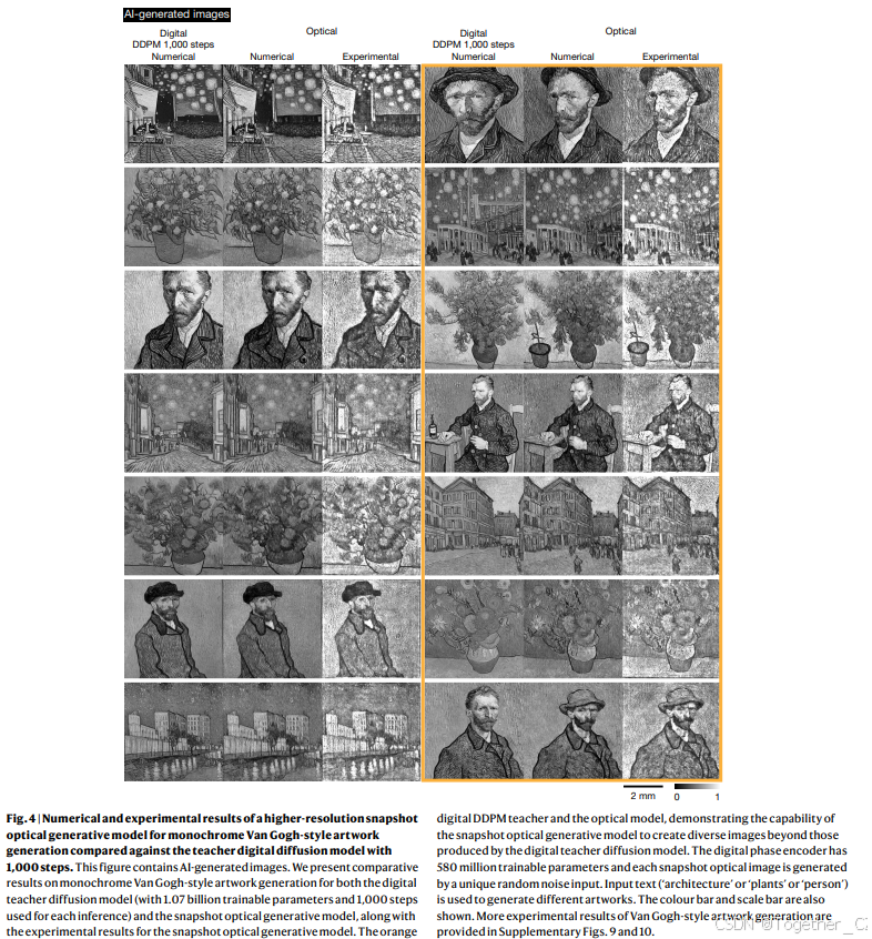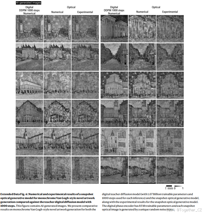 扩展数据图 6 | 单色梵高风格全新艺术作品生成的快照光学生成模型的数值和实验结果与 1000 步的教师数字扩散模型对比