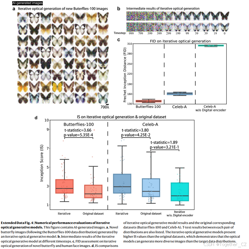 本图包含 AI 生成的图像。a, 由迭代光学生成模型生成的全新蝴蝶图像(遵循 Butterflies-100 数据分布)。b, 迭代光学生成模型在不同时间步的中间结果。c, 迭代光学生成全新蝴蝶和人脸图像的 FID 评估。d, 迭代光学生成模型结果与原始对应数据集(Butterflies-100 和 Celeb-A)的 IS 对比,其中还列出了每对分布之间的 t 检验结果。迭代光学生成模型的 IS 值高于原始数据集,这表明光学模型能够生成比目标数据分布更多样化的图像。