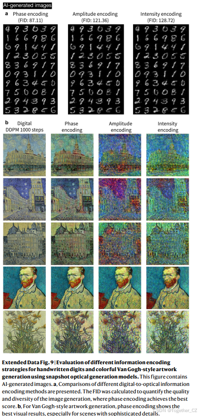 扩展数据图 9 | 使用快照光学生成模型对手写数字和彩色梵高风格艺术作品生成的不同信息编码策略的评估