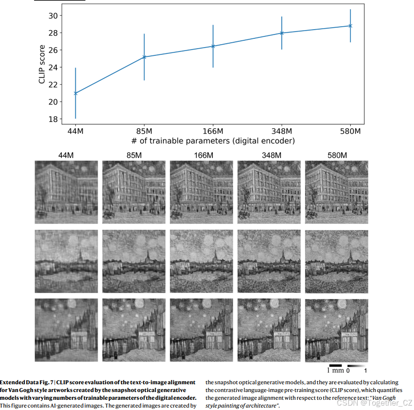 扩展数据图 7 | 快照光学生成模型生成的梵高风格艺术作品的文本-图像对齐的 CLIP 分数评估