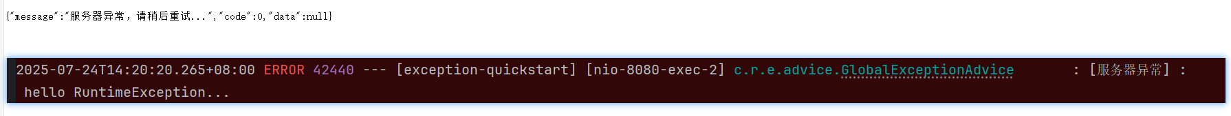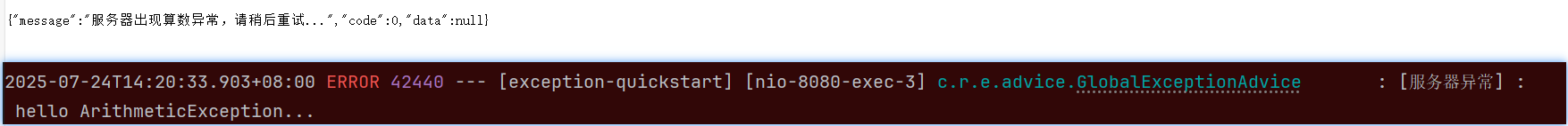 当我们向上抛出不同异常并不catch时,异常最终会到达全局异常处理器,控制台结果如下: