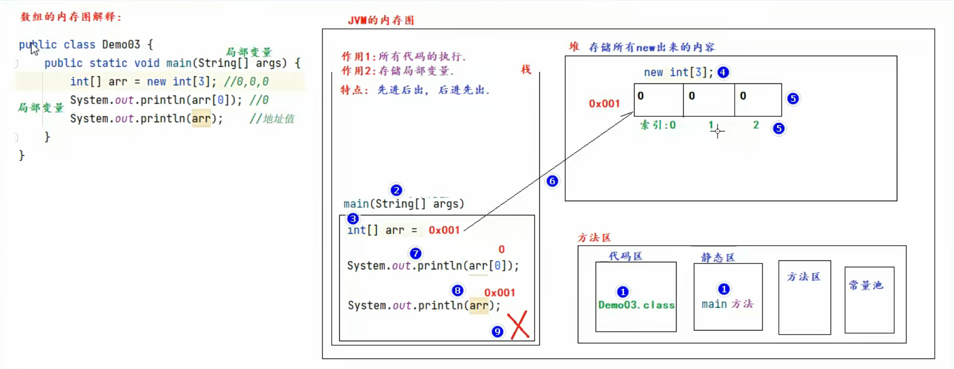 2.数组中每个元素都有默认值,int->0,double->0.0,boolean->false,String->null