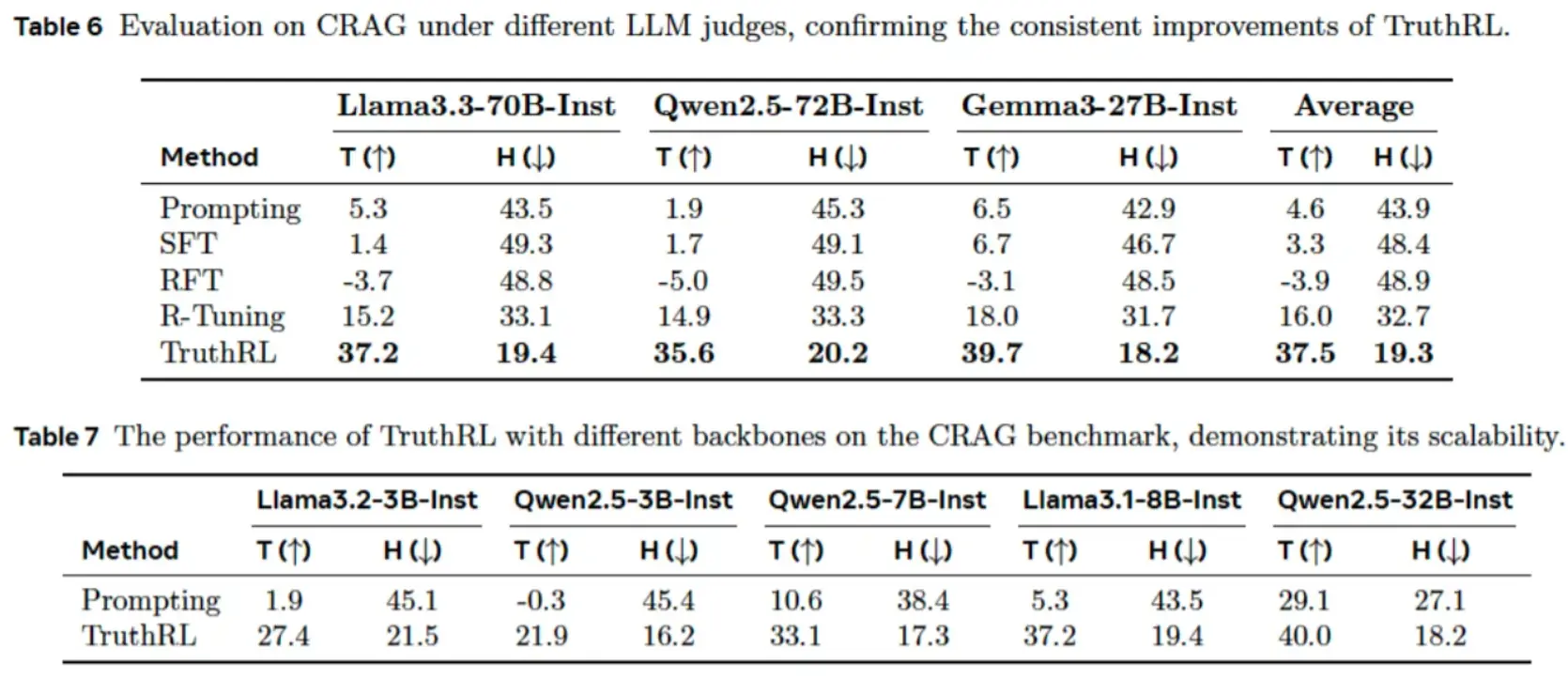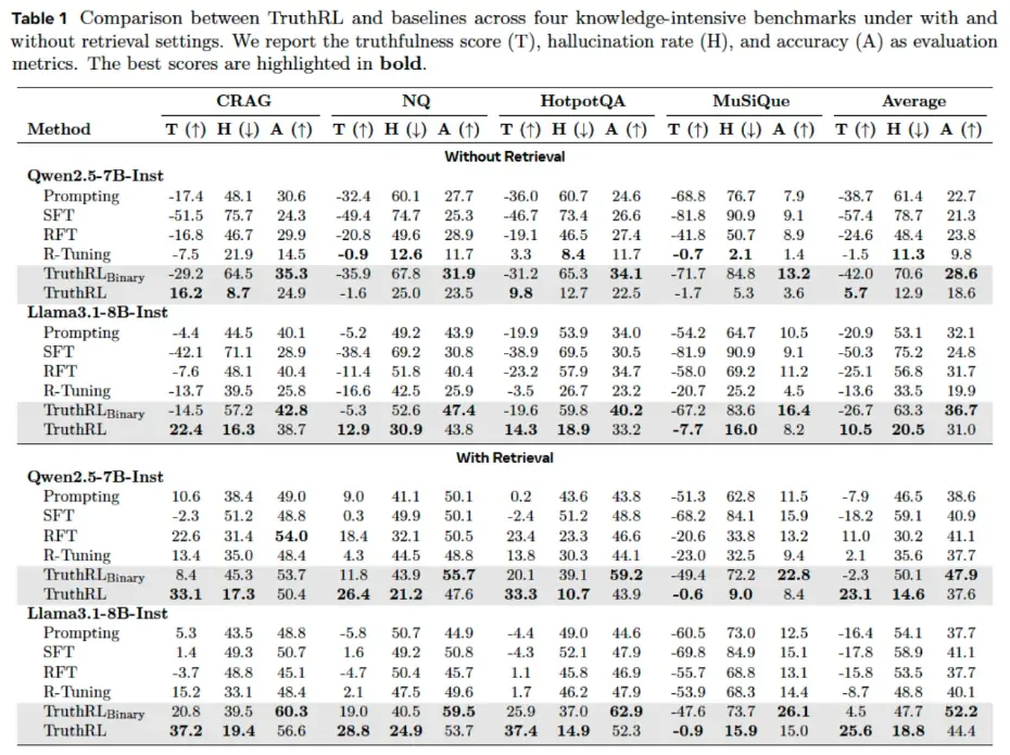 在所有测试中,TruthRL 全面超越了传统基线方法。与标准强化学习相比,它将幻觉(AI 一本正经胡说八道的情况)减少了**平均 28.9%,同时将整体真实性评分提升了21.1%**。