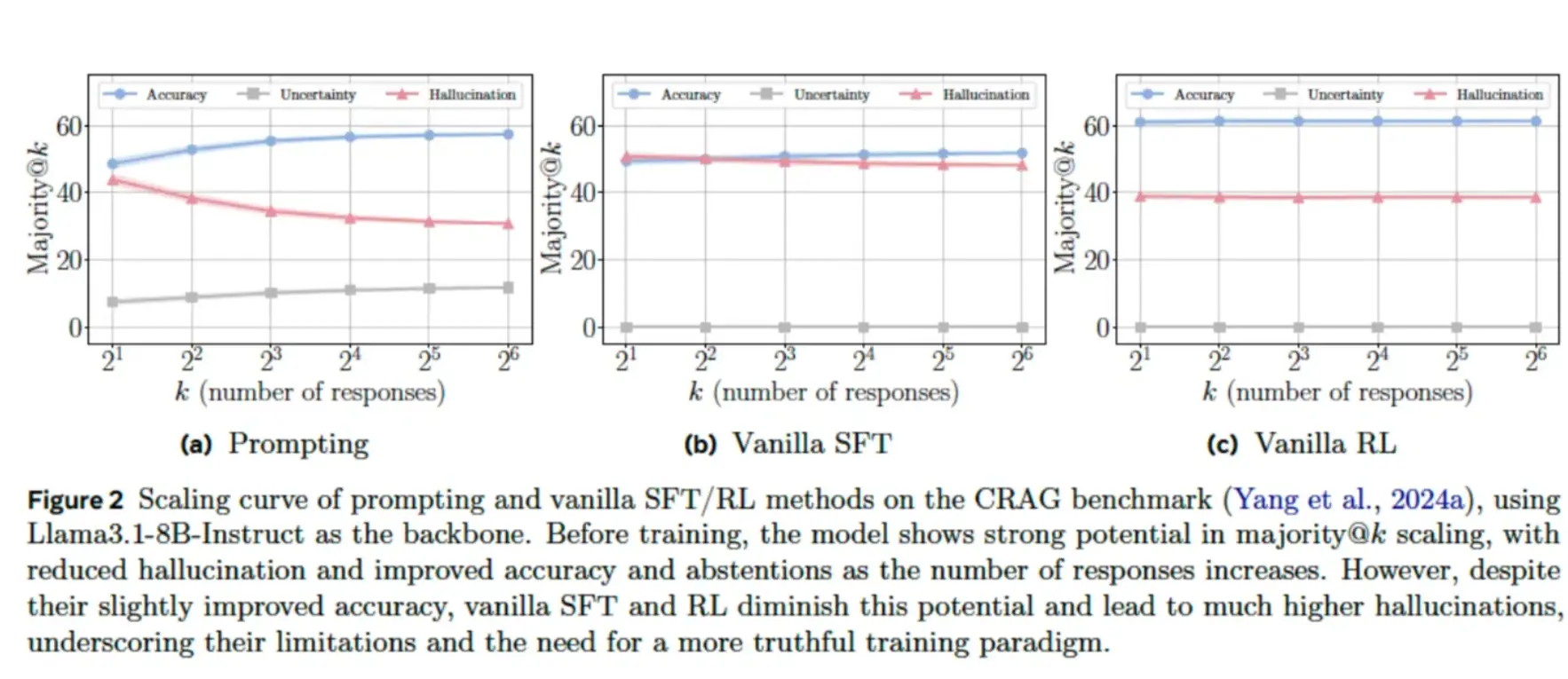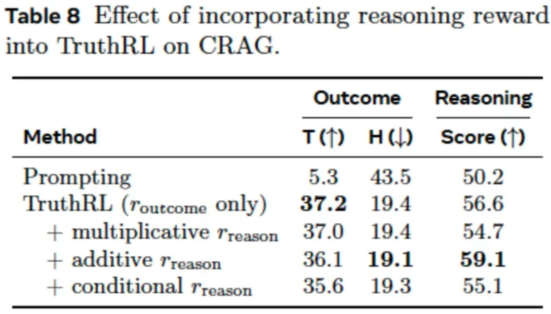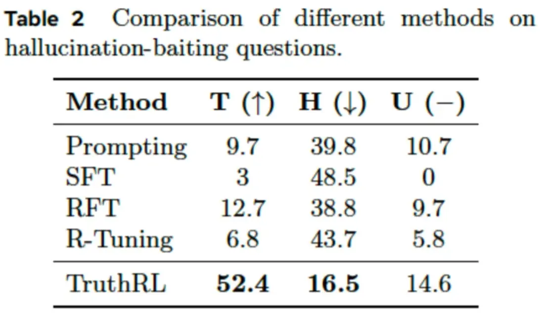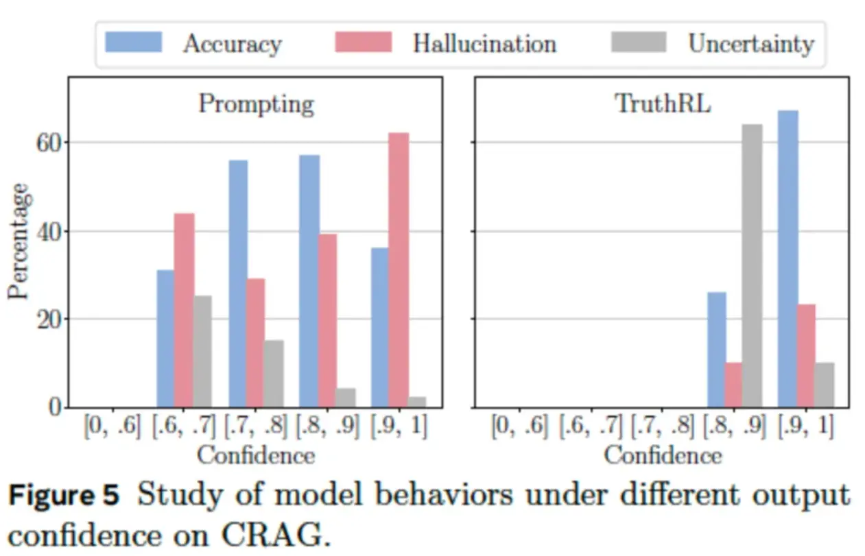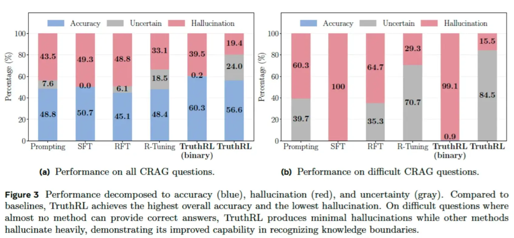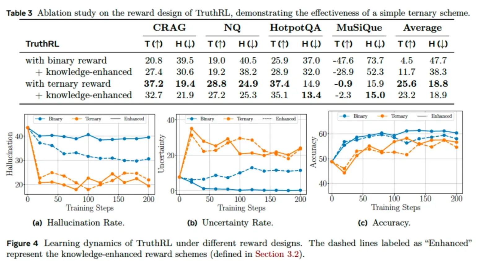 在消融实验中,一个颇具启发性的发现出现了:当研究人员采用传统的二元奖励机制------也就是模型只有在回答正确时才获得奖励------结果反而让模型**更容易产生幻觉(hallucination)**。虽然它在"已知事实"上的正确率确实有所提升,但模型变得更加"大胆地猜",倾向于在不确定时也硬给出答案。