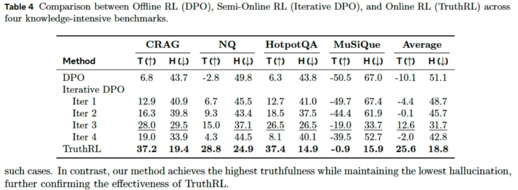 这个结果验证了一种长期存在的直觉:**单纯追求准确率,其实可能会削弱模型的真实度(truthfulness)**。换句话说,如果奖励函数只奖"对",不罚"乱说",模型就会学会提高"命中率",而不是追求"说真话"。